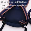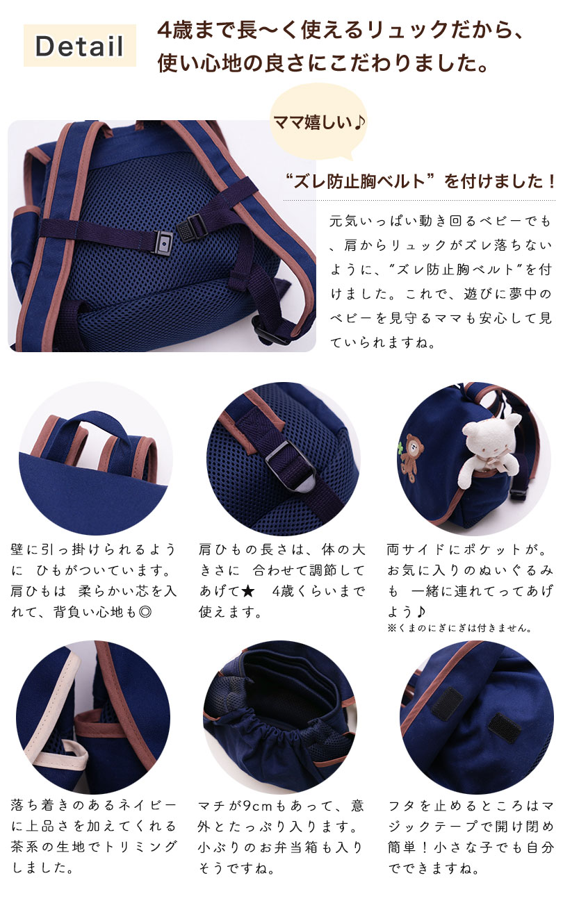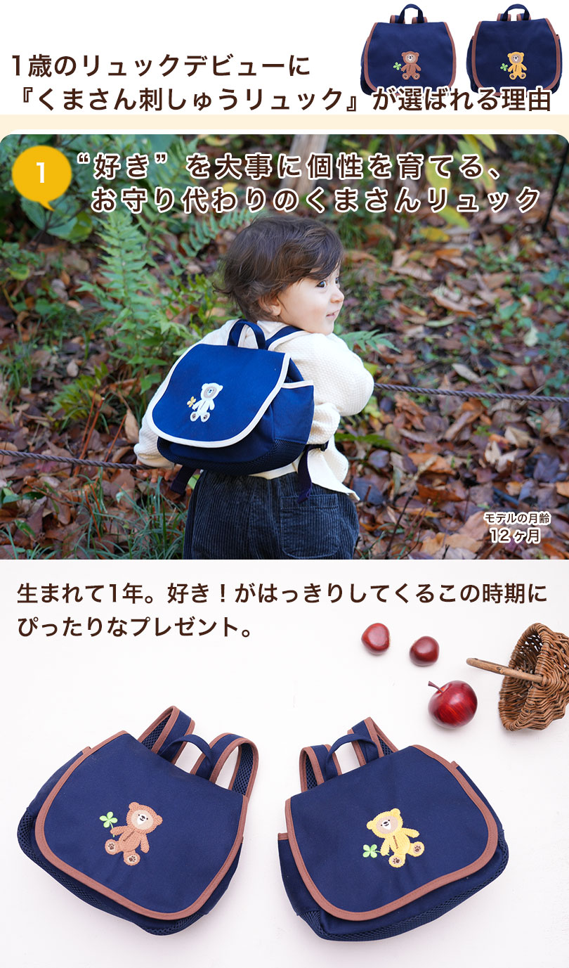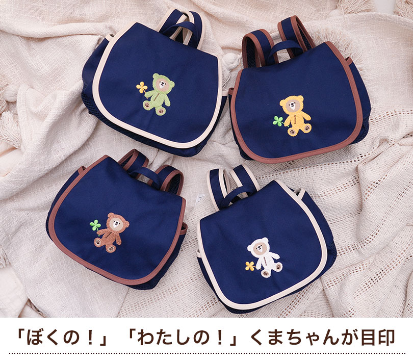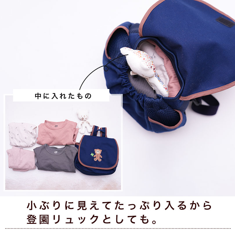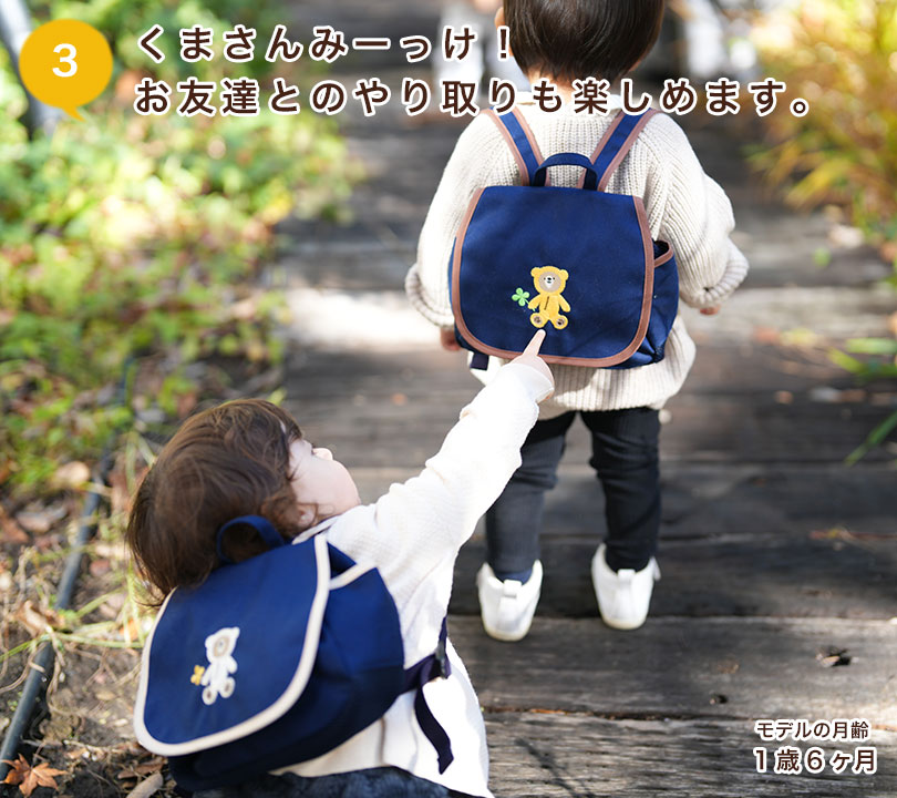 ネイビーの生地にくっきり映える色の刺しゅう糸で、大きめに刺しゅう入れしたくまさん。ベビーの目に留まることも多く、撮影中もお友達のリュックのくまさんに気付いて指さしたり、いい子いい子と触ってみたり。とっても可愛い掛け合いが見られました。
