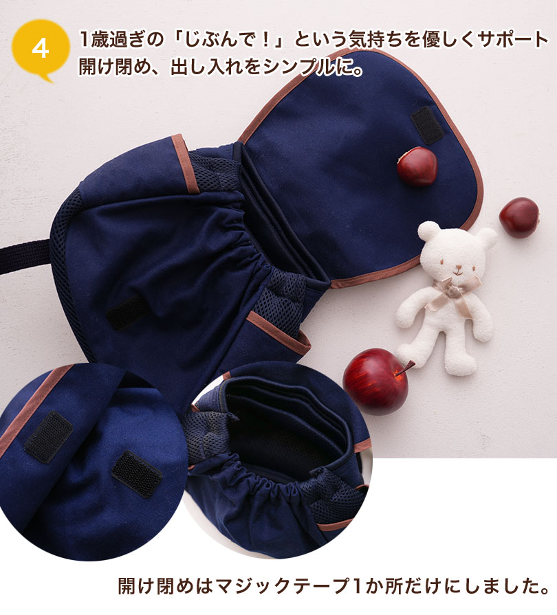 例えば、じぶんのおもちゃを、じぶんのリュックに入れたい!そんなときもベビーの小さなおててで開け閉めがしやすいように、開け閉めはマジックテープで、しかも1か所だけ。