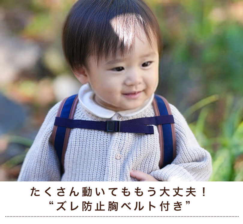 歩き出してリュックが大活躍する頃には、だいぶ思い通りに動き回れるようになって、いろんな元気いっぱいな姿が見られるようになります。たくさん動いてもリュックの肩ベルトがズレにくいように、“ズレ防止胸ベルト”が付きました。胸ベルト自体も長さの調節が出来るので、ベビーの身体の成長に合わせて調節していただけます。