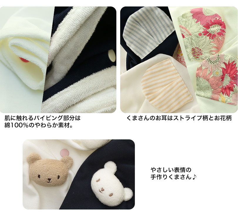 | 素材 | 本体:東レ「アロフト®」使用カノコ(綿55%・ポリエステル45%) パイピング/くま耳部分:綿100% (当店のアイテムは全てホルマリン検査済です) |